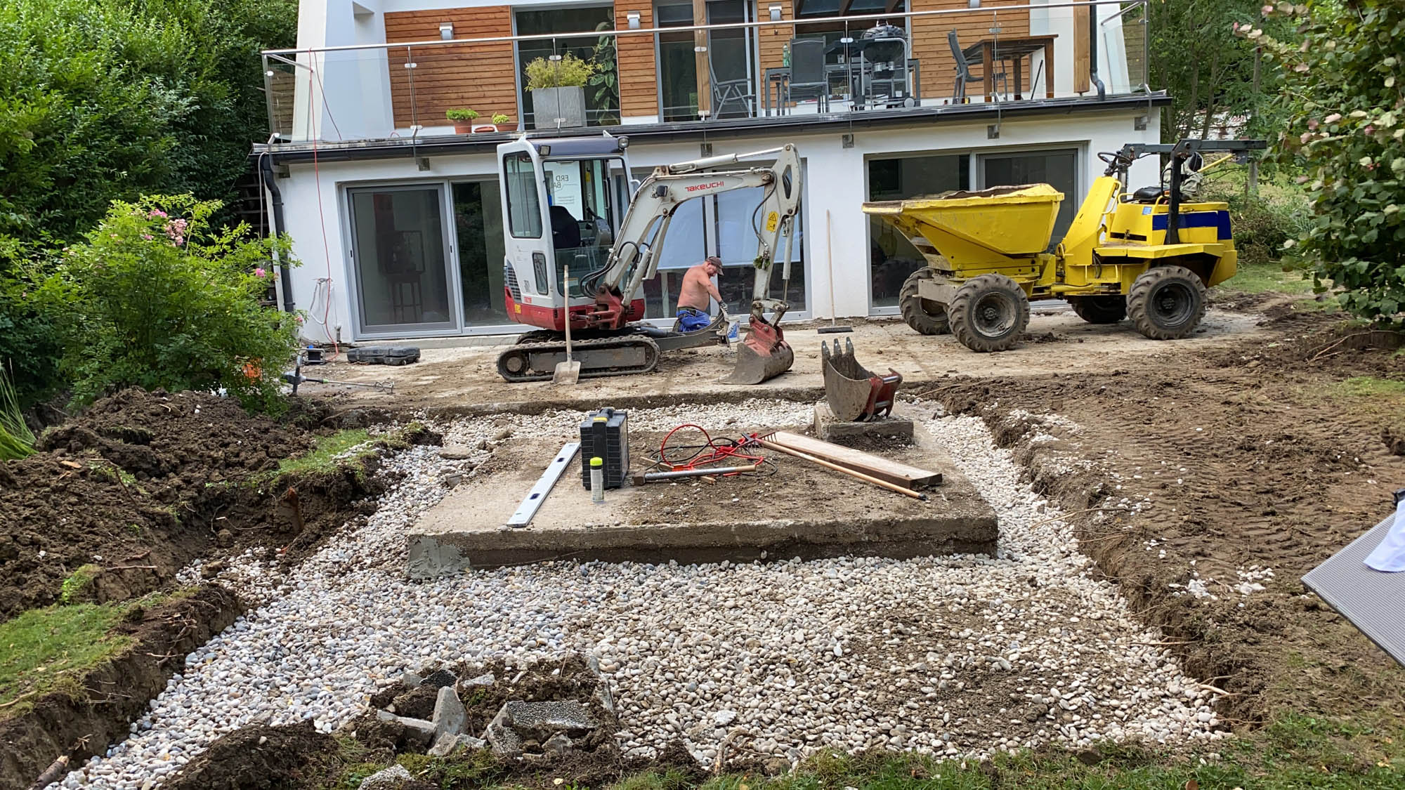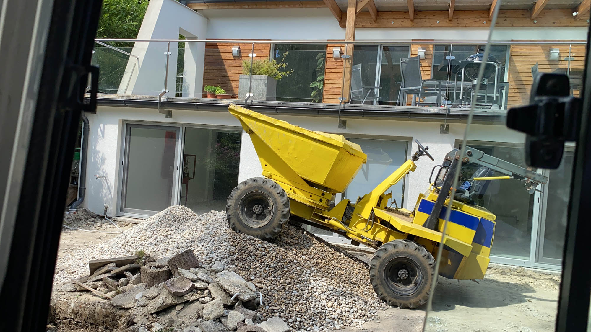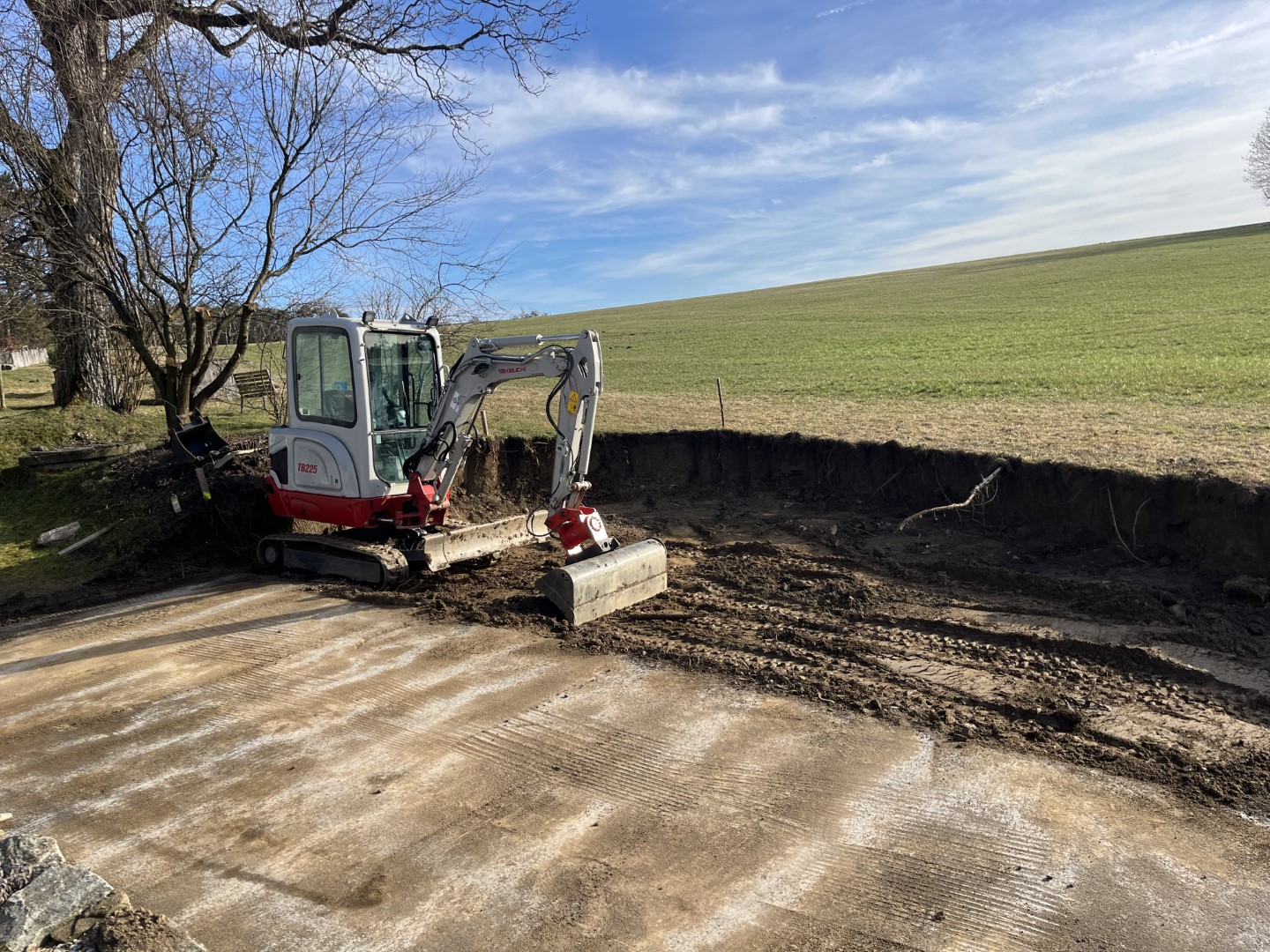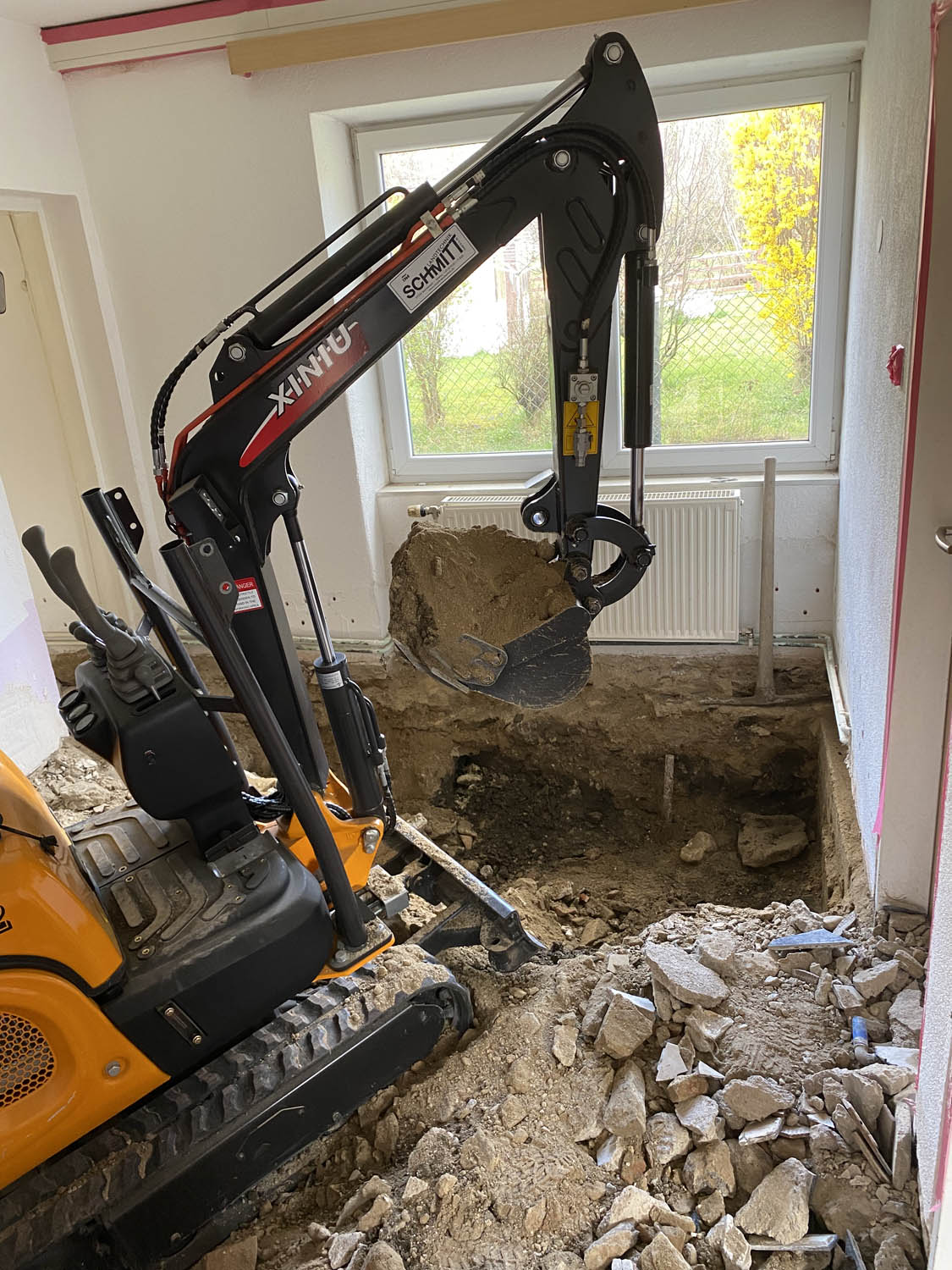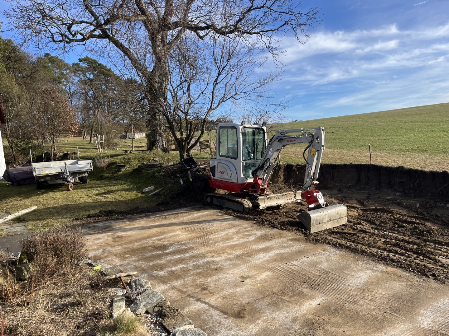 Baggerarbeiten im und rund ums Haus möglich. Unser kleinser Minnibagger beginnen bei 800kg und passt durch Ihre Eingangstüre. Dann folgen unsere 2,5 Tonnen Bagger und für die großen Artbeiten steht uns ein 15 Tonnen Bagger zur Verfügung.
